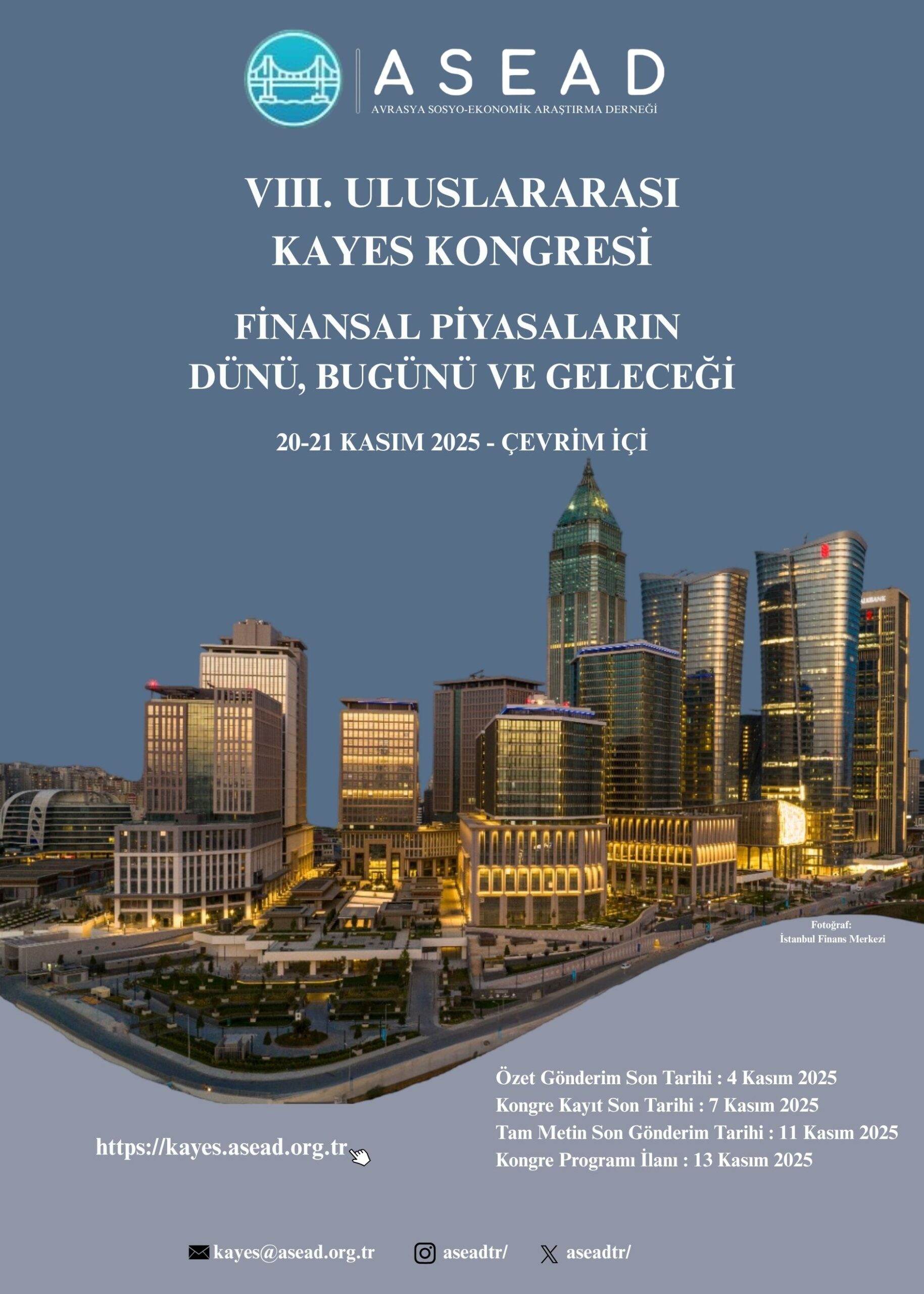 Uluslararası KAYES Kongreleri serisi Avrasya Sosyo-Ekonomik Araştırmalar Derneği (ASEAD) tarafından düzenlenmektedir. Bu yıl 8.’si 20-21 Kasım 2025 tarihlerinde “Finansal Piyasaların Dünü, Bugünü ve Geleceği” ana teması ile çevrim içi olarak düzenlenecektir. VIII. Uluslararası KAYES ile amaçlanan, finansal piyasaların dünü, bugünü ve geleceğini ulusal ve uluslararası bazda tüm boyutları ile ele almak, siz değerli akademisyenlerin, sektör […]